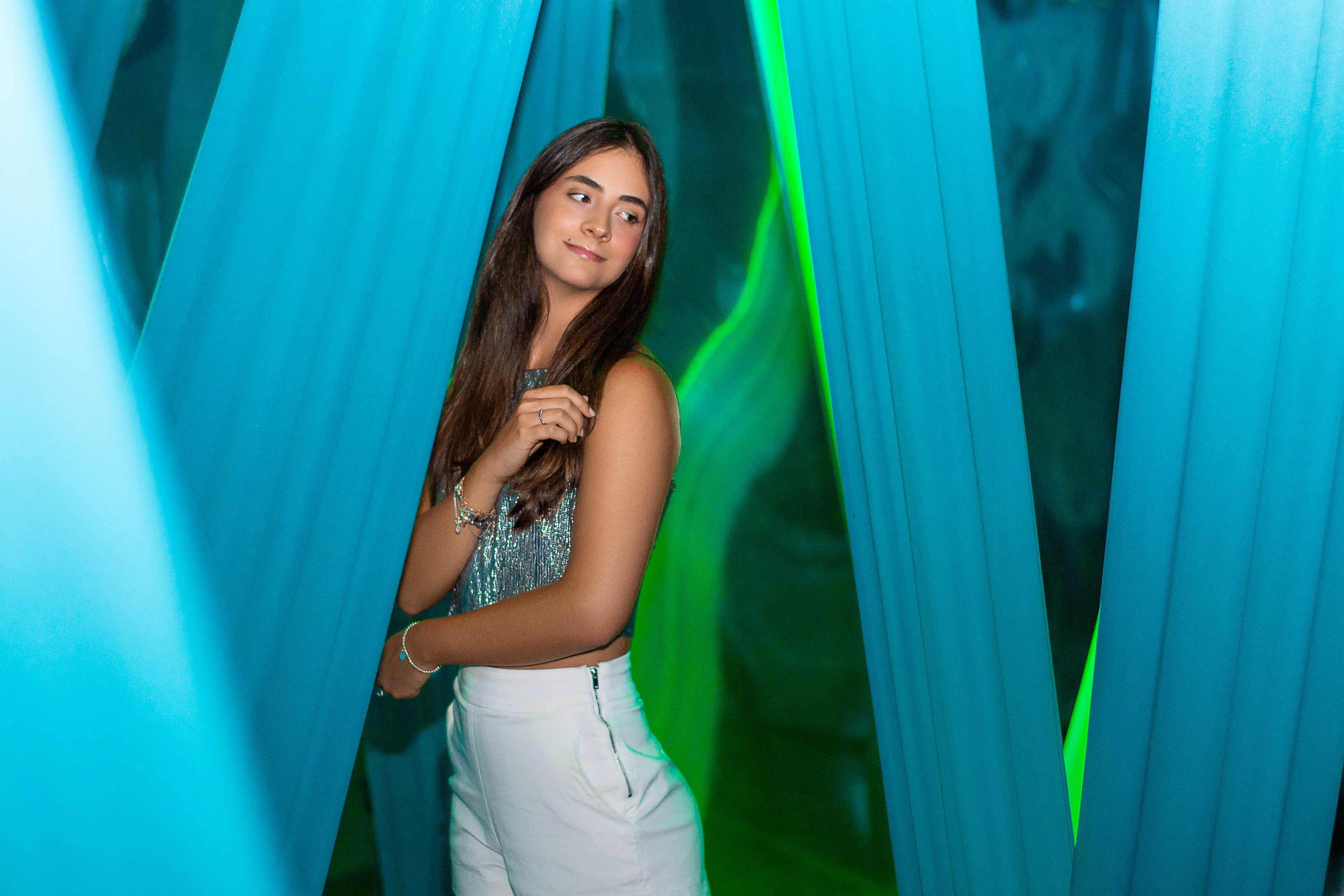 Quando vimos a exposição "Reflexos [in]versos no País das Maravilhas" no Farol Santander, soubemos na hora que seria um local único para fazermos um ensaio de 18 anos. As cores e luzes, em harmonia com o look que montamos, criaram um ambiente de festa com um toque de magia. Conseguimos até imaginar como seria uma noite no País das Maravilhas, não?